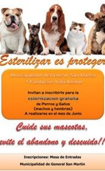 La Municipalidad de General San Martín y la Fundación Vida Animal, invitan a inscribirse para la esterilización gratuita de perros y gatos (machos y hembras), a realizarse en el mes de Junio en la localidad.